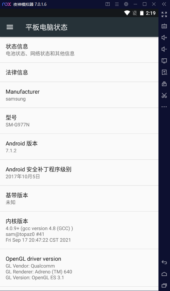 本文使用的Android设备为夜神模拟器最新版本(7.0.1.6),Android版本为7.1.2