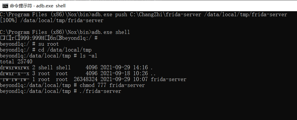 下载解压后使用命令adb.exepush C:\ChangZhi\frida-server data/local/tmp/frida-server将frida服务端传送到Android设备中
