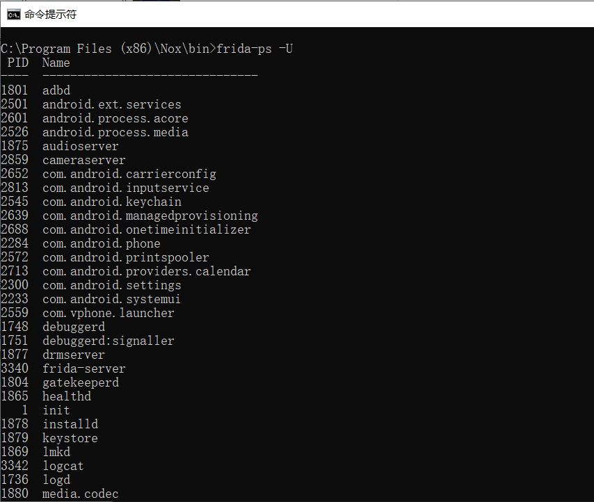 最后执行frida-ps-U命令,使用frida查看所连接的Android设备的进程列表,输出进程列表则证明frida的服务端可客户端均已安装部署成功。