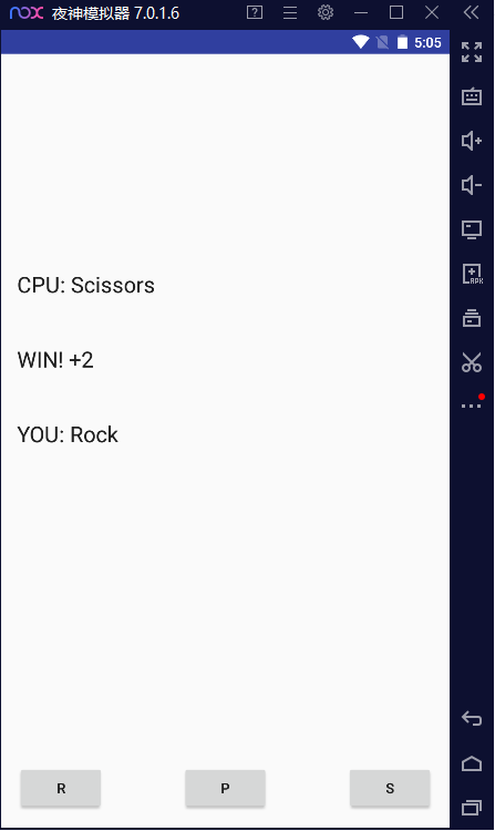 然后下载官方提供的APK并安装到模拟器上,这个APP是一个石头剪子布的游戏,通过点击下方的R、P、S三个按键和机器进行石头剪刀布的游戏,游戏的结果会在屏幕上显示。