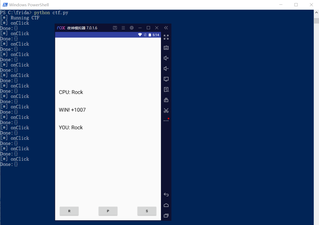 运行上面的Hook脚本,此时会发现,点击R、P、S三个按钮中的任何一个,每次游戏都会获得“WIN!”,这是由于frida在程序运行过程中修改了游戏的结果,使得返回的游戏结果都是机器输自己赢。