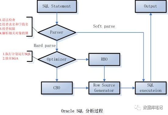 一条SQL通过解析器,首先判定SQL的语法和语义有没有差错,如果有,返回错误,如果正确,则在内存中share pool中去寻找和当前SQL有相同hash值的sql,如果找到了,则代表此SQL已经解析过了,通过软解析方式直接执行。如果找不到,则使用硬解析的方式执行,硬解析通过优化规则不同,分别可采用CBO或RBO的方式来生成执行计划执行该SQL。