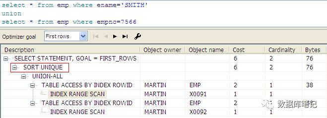 通常情况下, 用UNION替换WHERE子句中的OR将会起到较好的效果. 对索引列使用OR将造成全表扫描. 注意, 以上规则只针对多个索引列有效. 如果有column没有被索引, 查询效率可能会因为你没有选择OR而降低. 在下面的例子中, LOC_ID 和REGION上都建有索引。