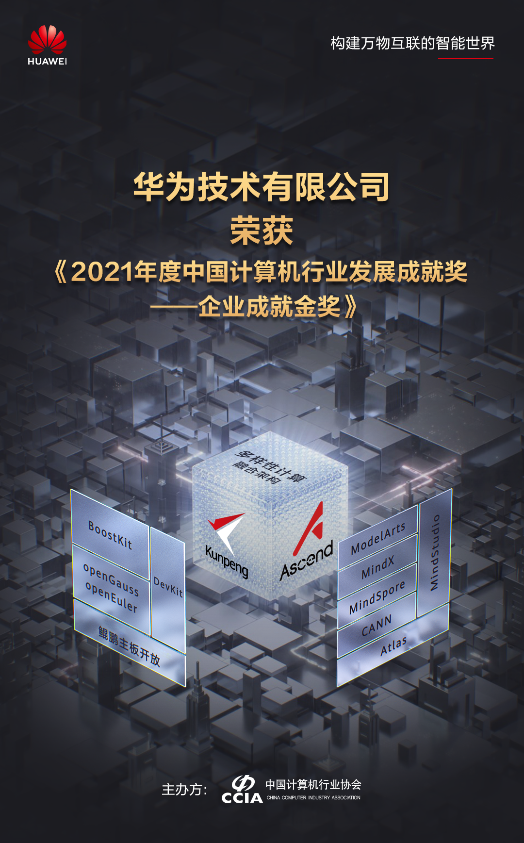 华为公司凭借鲲鹏+昇腾的计算产业发展战略,联合产业伙伴为中国计算机产业发展作出的突出贡献,荣获《2021年度中国计算机行业发展成就奖—企业成就金奖》。