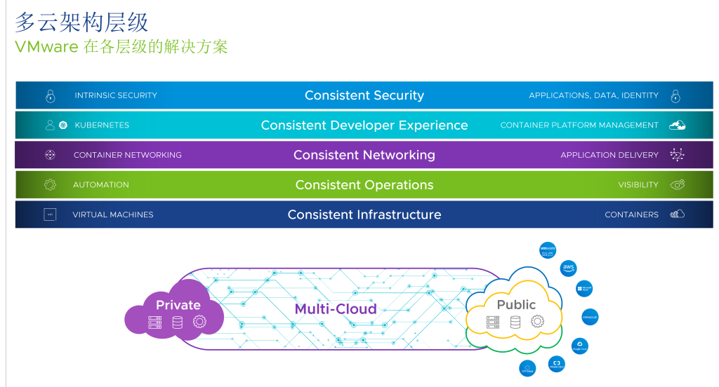 VMware将多云架构解决方案分为了五个层级,每个层级代表一个“图鉴”功能,基本围绕“一致性”这个关键词展开。最底层,一致性基础设施,基于VCF (VMware Cloud Foundation),实现一致性基础云堆栈,支持上层构建无论是虚拟机还是容器的各种应用;一致性运维。让用户能看到不同的云资源池,并提供一致性管理,为上层应用支撑服务,部署应用和开发应用;一致性网络。不同的云采用的网络架构不同,策略不同,如果负载在不同云之间做迁移,没有一致性的网络将造成迁移不便或停机,一致性网络能更好地为企业提高云自由性;一致性开发体验。将开发人员从底层架构负担中解救出来,提供一个可用于从最初应用构建,到运行,再到后期维护的一致性平台,让开发人员专注应用开发和业务创新;一致性安全。传统安全模式是做周边防护,设置防火墙,无法探测应用内部尤其是云原生内部应用之间是否隔离,VMware采用零信任安全理念,利用多种云技术构建一个更加安全可靠的云环境。