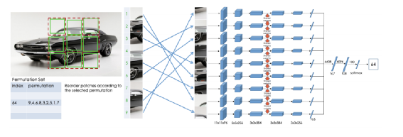 将9个小图随机打散顺序得到一种基于原图顺序排列组合,然后每个小图进入Encoder得到特征输出,特征进入各自的全连接网络(不共享)后输出变换特征