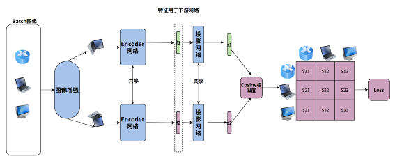 # clr 投影模型self.predictor_model_clr = tf.keras.Sequential([tf.keras.layers.Dense(self.PROJECT_DIM,use_bias=False,),tf.keras.layers.LeakyReLU(alpha=0.18),tf.keras.layers.Dense(self.PROJECT_DIM),])def forward_simclr(self, inputs, training, compute_err, valid):parallel = 1if self.multi_gpu:parallel = self.strategy.num_replicas_in_syncimg1, img2 = self.get_aug_img(inputs["image"], training)_, _, feature1 = self.model(img1, training=training)_, _, feature2 = self.model(img2, training=training)z1, z2 = self.predictor_model_clr(feature1), self.predictor_model_clr(feature2)'''将sequence feature 转为 frame的feature'''z1, z2 = self.feature_flat(z1), self.feature_flat(z2)loss = self.info_nce_loss(z1, z2)result = {"total_loss": loss}return {k: v / parallel for k, v in result.items()}def info_nce_loss(self, projections_1, projections_2):projections_1 = tf.math.l2_normalize(projections_1, axis=1)projections_2 = tf.math.l2_normalize(projections_2, axis=1)similarities = (tf.matmul(projections_1, projections_2, transpose_b=True) / 0.1)batch_size = tf.shape(projections_1)[0]contrastive_labels = tf.range(batch_size)'''希望正样本的图片特征相似度足够大,负样本对相似度足够小,采用交叉熵的方式正样本的label=1,负样本=0'''loss_1_2 = tf.keras.losses.sparse_categorical_crossentropy(contrastive_labels, similarities, from_logits=True)loss_2_1 = tf.keras.losses.sparse_categorical_crossentropy(contrastive_labels, tf.transpose(similarities), from_logits=True)'''交叉预测'''loss = (loss_1_2 + loss_2_1) / 2return tf.reduce_mean(loss)