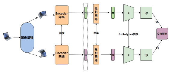 两个投影向量分别会和一个KxD 的向量(图中的C,论文作者称之Prototypes)相乘得到变换后的向量,这个K可以假设就是K个类,每一行向量可以代表这个类表示(聚类中心),可以认为相乘后的结果就是图片表征向量和K类的相似度,记作为ZtC,ZsC,其中C是参与学习。