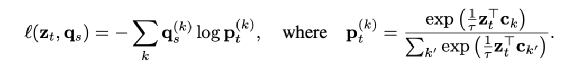 然后采用交换预测的方法,也就是t的聚类结果去预测s,同样s也去预测t,loss采用交叉熵,如下: