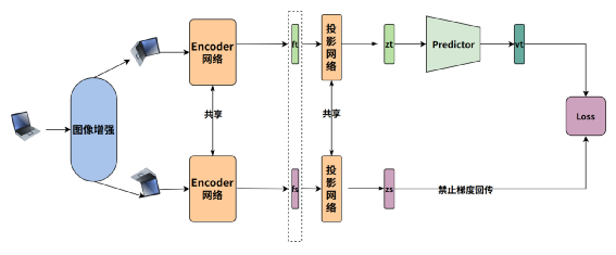 一张图像经过两次不同增强后,再经过Encoder编码的图像特征经过投影变化后得到特征Zt,Zs