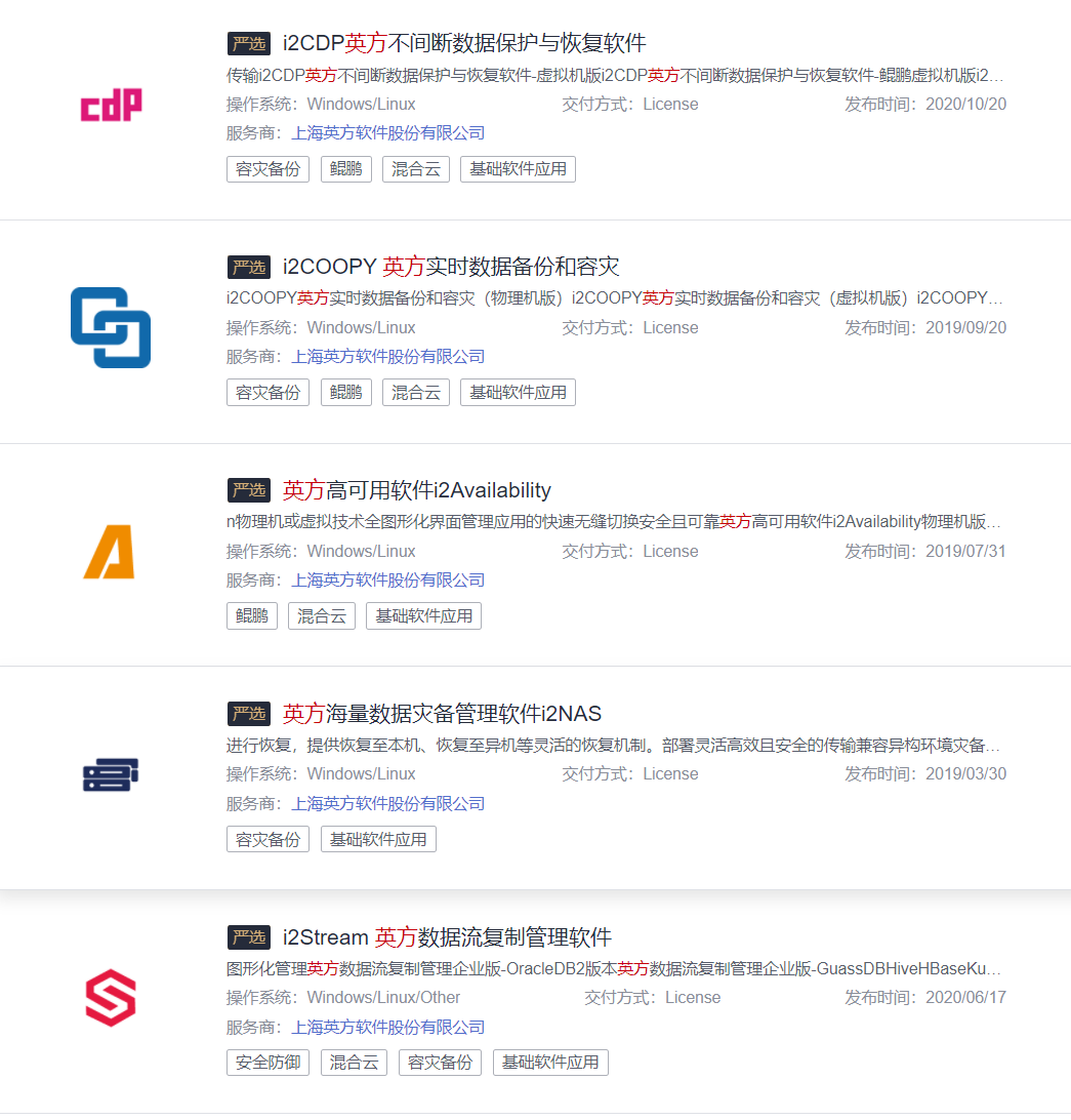 截止目前,英方已在华为云市场上线 20 多款产品和服务,产品涉及数据复制、迁移、高可用、数据持续性保护等方面,交付方式涉及镜像部署、license、人工服务等类型,其中有多款产品和服务在华为云严选专区上线。