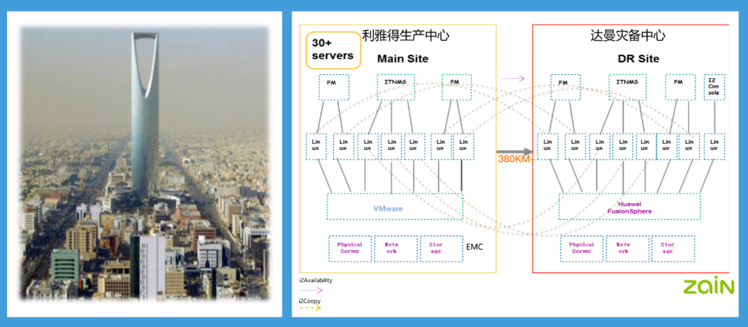 在沙特运营商 ZAIN 异地容灾具体案例中,英方联合华为云在异地构建数据灾备中心,为用户近 30 多个应用系统提供了应用级别高可用方案。ZAIN 系统繁多、两边存储完全异构,包括 Oracle, DB2, ITM, TCR 等,且生产中心和灾备中心相距 380 公里之远,对数据传输的时效性和一致性要求很高。