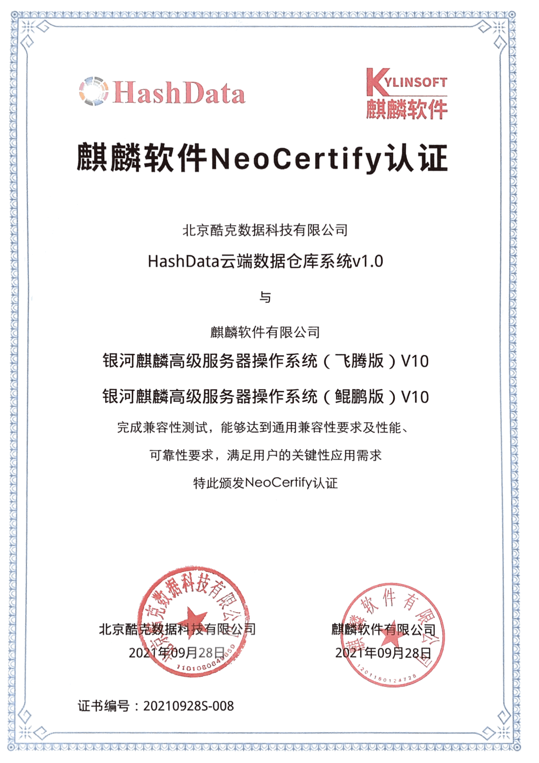 ,HashData正式通过麒麟软件 NeoCertify 认证,与银河麒麟高级服务器操作系统 V10 完成兼容性互认证测试。