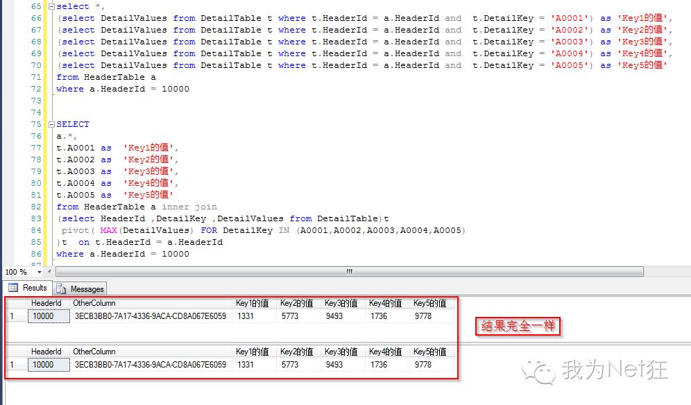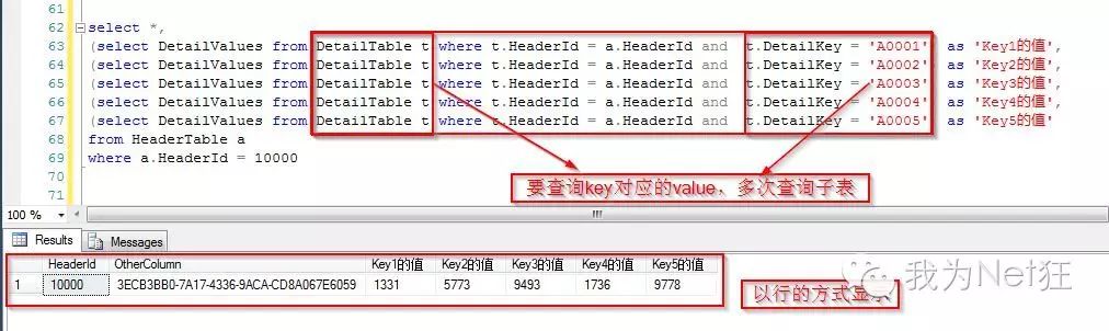(select DetailValues from DetailTable t where t.HeaderId = a.HeaderId and t.DetailKey = 'A0001') as 'Key1的值',