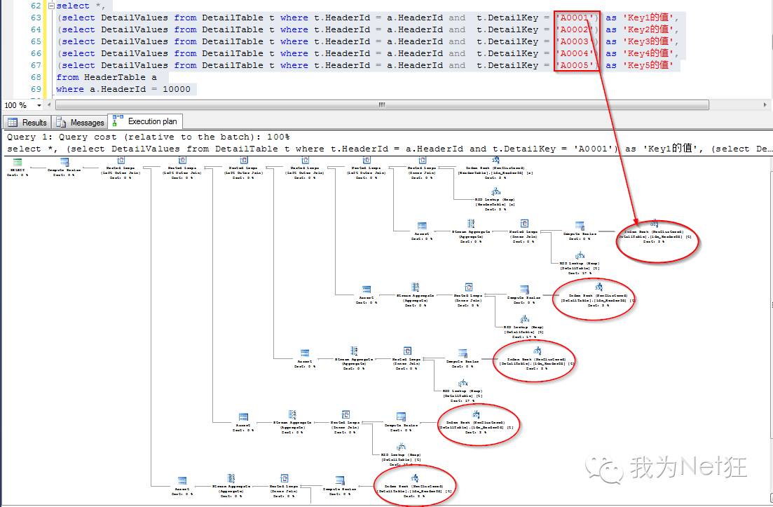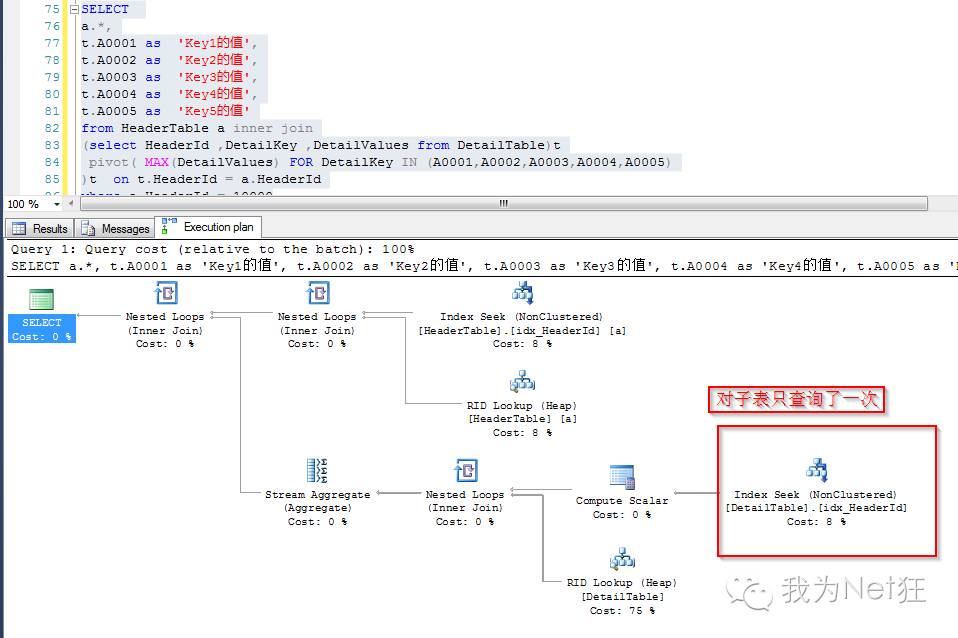 那么看一下后一种查询方式也即通过行业转换之后做join的执行计划,可以看到只对字表进行了一次查找(这里是index seek,但是暂抛开索引)