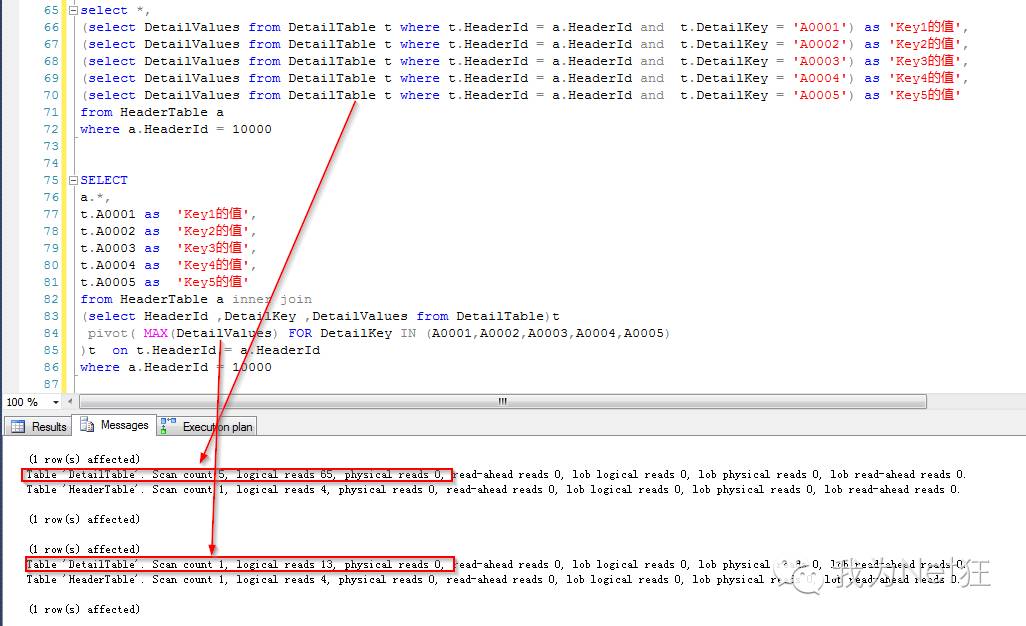 观察一下两条SQL的IO信息,可以发现,前者的Scan count是5,逻辑读是65,后者的Scan count是1,逻辑读是13,65=13*5。可见后者是一次性将表中的几个Key值读取出来的,而前者每个Key值读取一次表。
