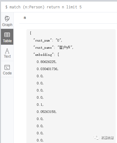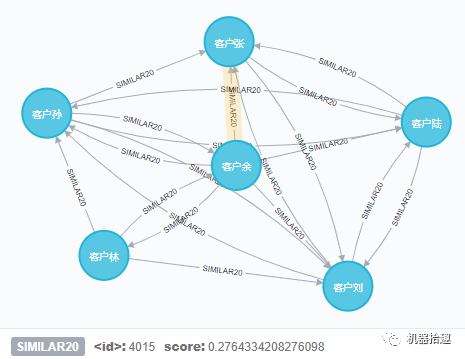 从结果可以看到,迅速返回了客户号为“200”的“客户余”跟他最相似的客户节点,以及这些客户之间的相似度分数。