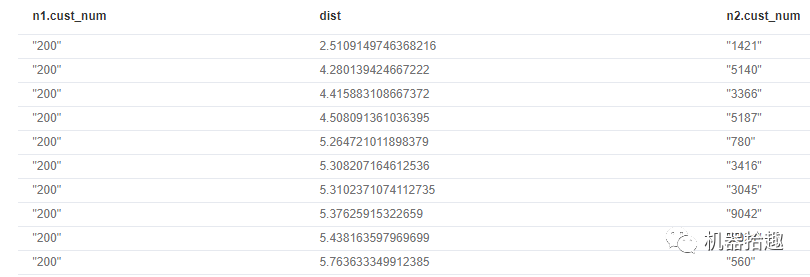 同样查询速度非常快,并且返回了客户号为200的用户,跟他距离最近的用户号及公里数。