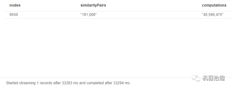可以看到,我们的大致有9550个用户,neo4j安装在笔记本电脑的docker中,这条CYPHER语句运行了33秒,生成了19万条关系,计算量是惊人的4500万!