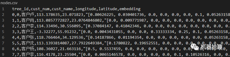 headers = ['tree_id', 'cust_num', 'cust_name', 'longitude', 'latitude', 'embedding']f_csv = csv.writer(f)