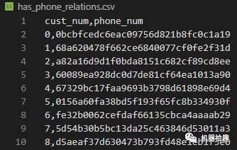 这个比较简单,我们将csv分为两列,第一列为用户id,第二列为手机号(这里的手机号做了脱敏处理):