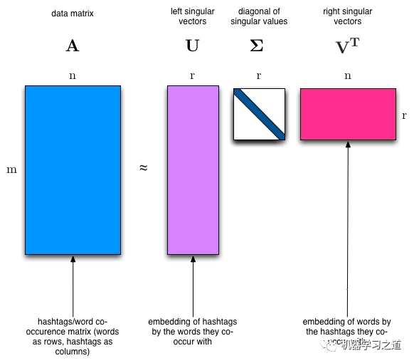 # 注意将s从一维向量转换成对角矩阵(diagonal matrix)np.allclose(U.dot(np.diag(s)).dot(Vh), vectors) # Truenp.allclose(U.T.dot(U), np.eye(U.shape[0])) # Truenp.allclose(Vh.dot(Vh.T), np.eye(Vh.shape[0])) # True