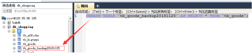 实践操作:CREATE TABLE `tb_goods_backup20181125` AS SELECT * FROM `tb_goods`;