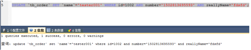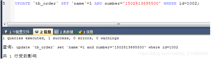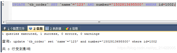 上面的是语法没报错,但实际结果也update到对应想要的结果但为什么name值就变成了 0 ,而且就只有放在语句前面的name字段有变更,后面number没有变更呢??问题点应该在:mysql 存在运算符,and 在set 这里可能 充当了运算符的作用更新操作set之后使用and 只会执行name = xx; 数据库经过运算结果为false 返回 0