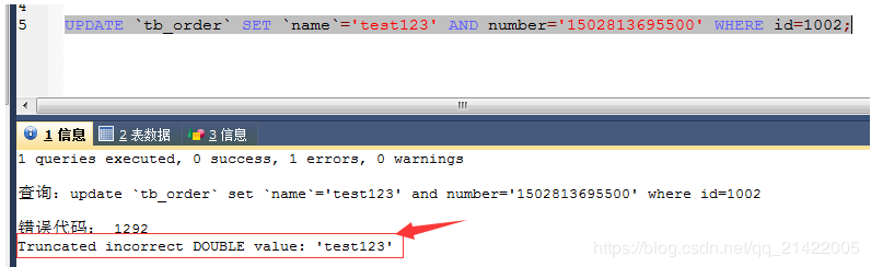 问题来了,为什么 name列表字段 set成 ‘test123’ 时就报错了??Truncated incorrect DOUBLE value: