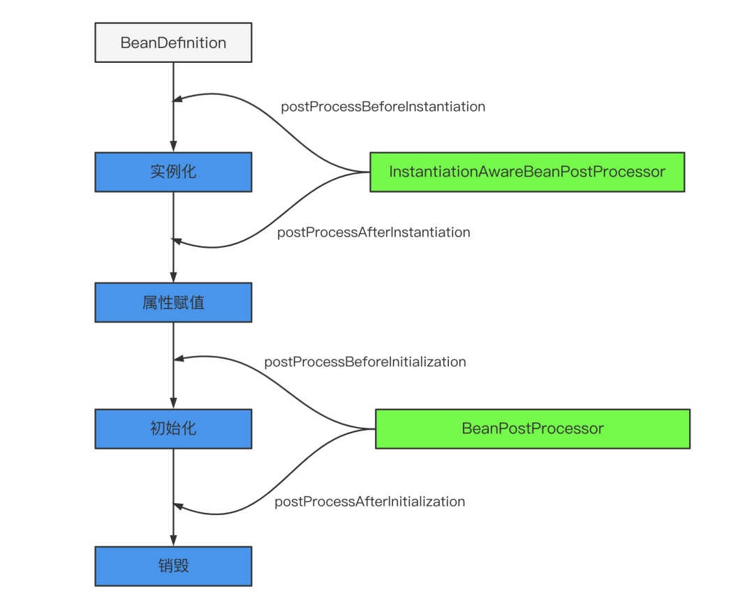 比如构造函数、getter/setter 以及 init-method 和 destory-method 所指定的方法等,也就对应着上文说的实例化 -> 属性赋值 -> 初始化 -> 销毁四个阶段。