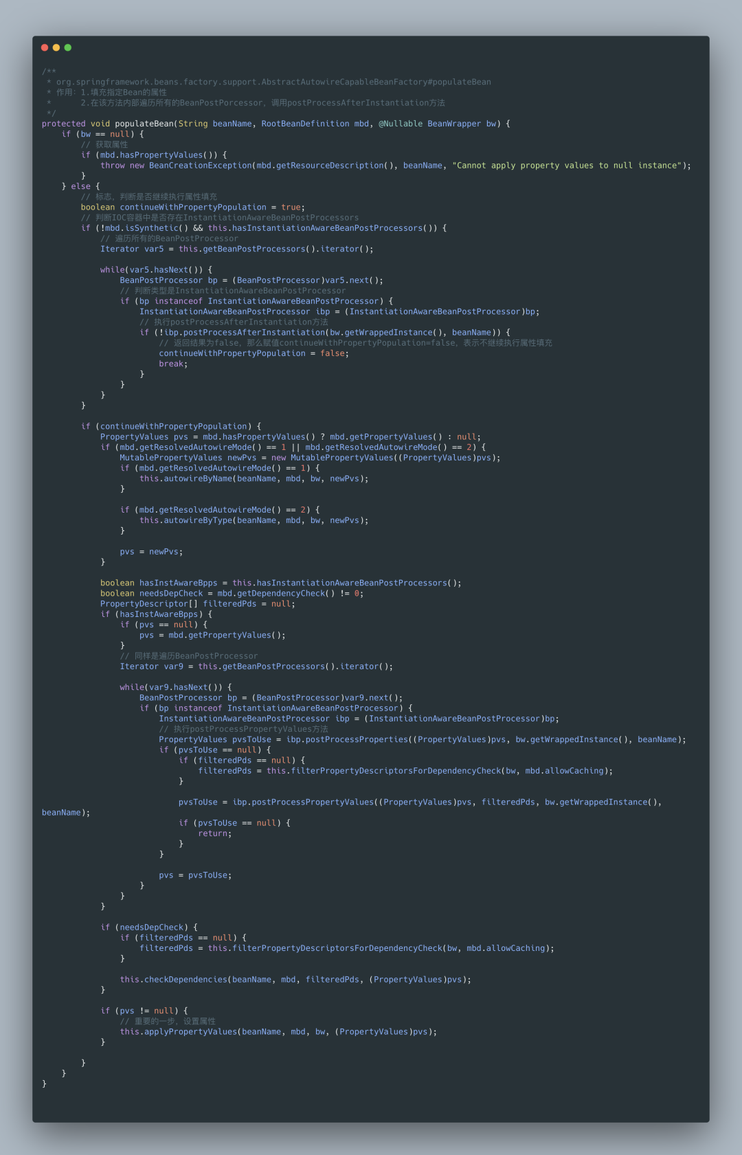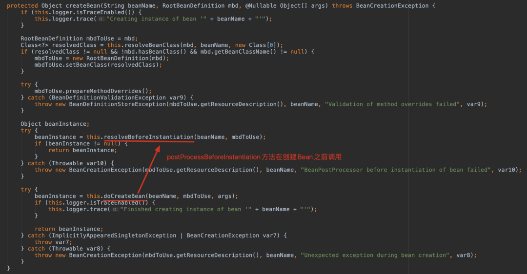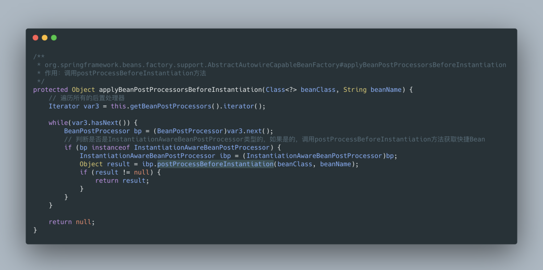 总之,postProcessBeforeInstantiation 在 doCreateBean 之前调用,也就是在 bean 实例化之前调用的,英文源码注释解释道该方法的返回值会替换原本的 Bean 作为代理,这也是 AOP 等功能实现的关键点。