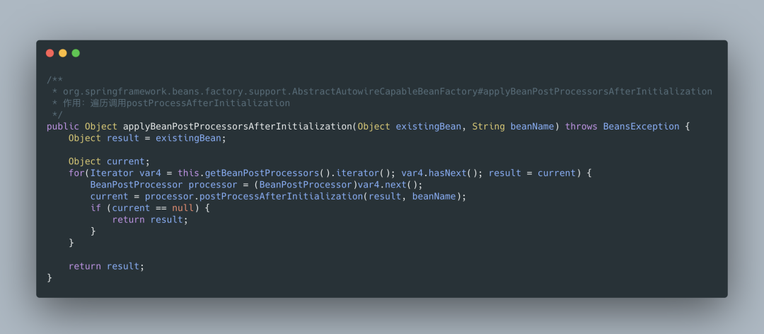 BeanPostProcessor接口中的postProcessAfterInitialization,在实例化之后调用。