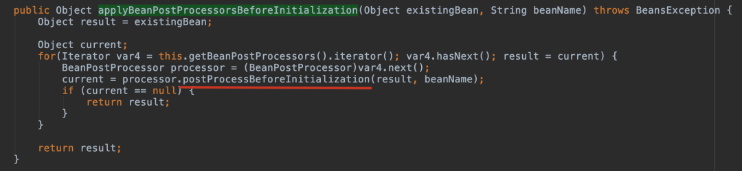 processor.postProcessBeforeInitialization(result, beanName);进入 postProcessBeforeInitialization 方法