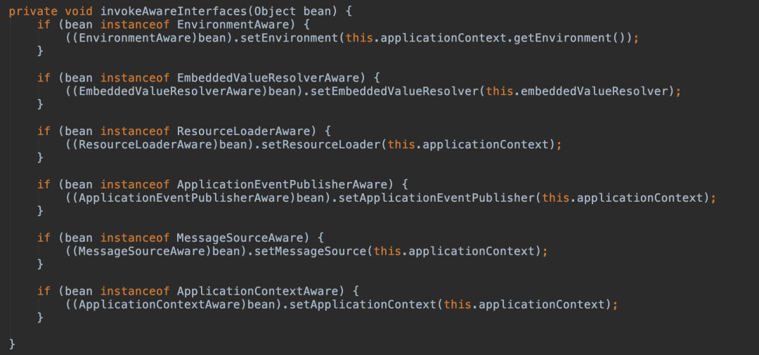 首先判断此 bean 是不是各种的Aware,如果是它列举的那几个 Aware 就获取 Bean 工厂的权限,可以向容器中导入相关的上下文环境,目的是为了 Bean 实例能够获取到相关的上下文,如果不是它列举的几个 Aware,那就调用invokeAwareInterfaces(bean)