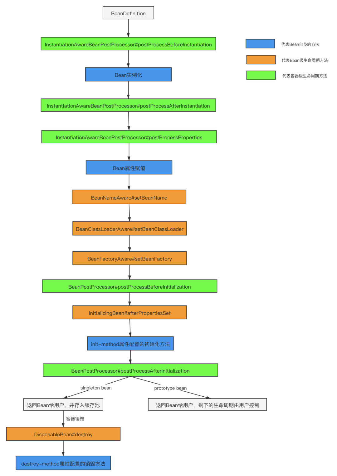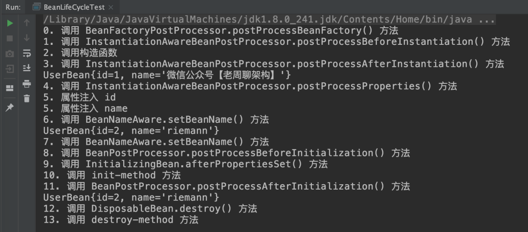 这里老周必须要提一下,这里我们说的 Spring Bean 的生命周期主要指的是 singleton bean,对于 prototype 的 bean ,Spring 在创建好交给使用者之后则不会再管理后续的生命周期。