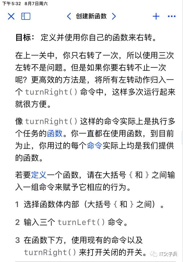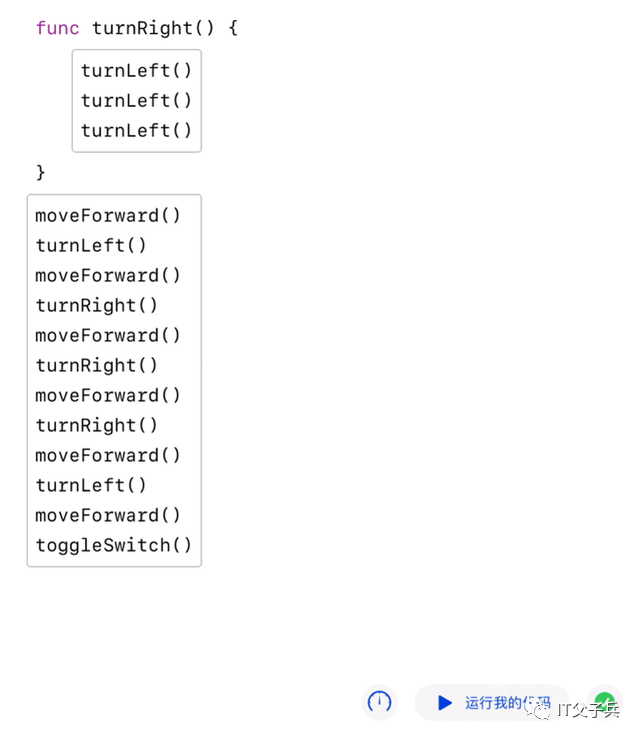 上一次,我们用三个左转,代替一个右转,现在,我们要用func定义函数,把组合写入函数中,如果要再次做出组合动作,调用函数即可,下面是思考结果: