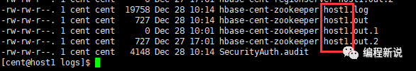 我开心地认为是不是所有问题都解决了,赶紧使用Java再调一下,发现还是一开始的错误。因为我每次重启Hbase时都会把logs目录清空,当我修改完hostname后重启时,我发现zookeeper的日志文件名称发生了变化,原来是以localhost结尾,现在变成以新的hostname结尾了,如图: