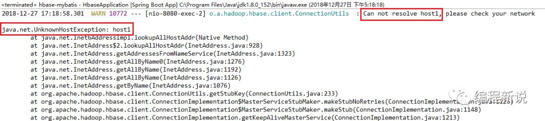 按照李大胖的推断,此时使用Java调用时,应该报的错是host1无法被解析,因为Windows并不知道host1是什么鬼。那就调一下试试吧,哈哈,果然是这样的,如图: