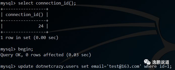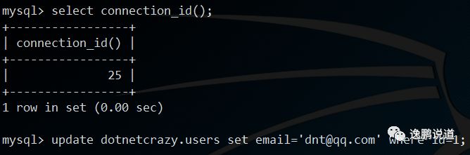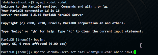 | x | update workdb.userssetemail='dnt@taobao.com'whereid=1; |