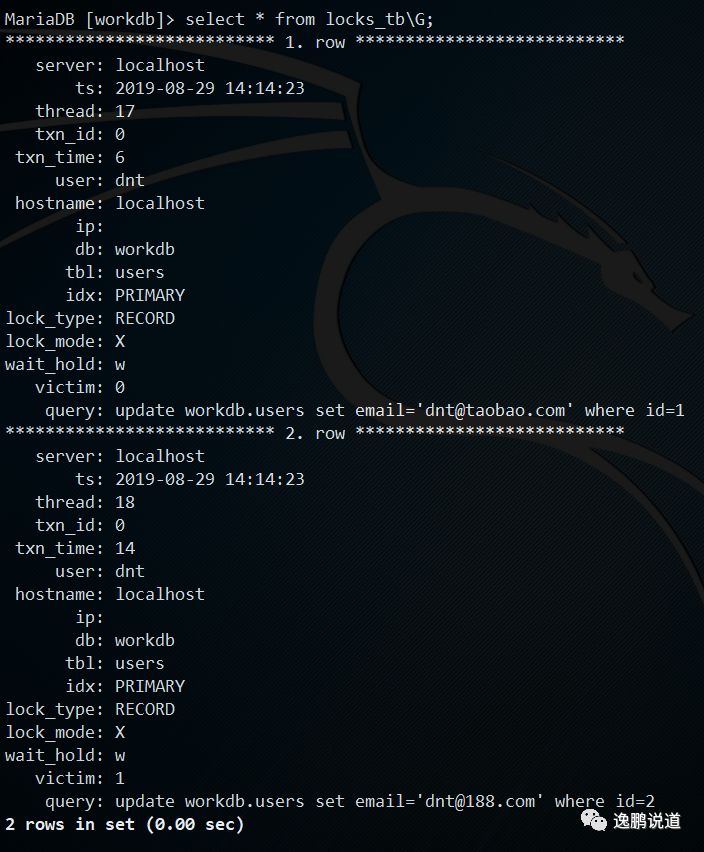 | x | update workdb.userssetemail='dnt@taobao.com'whereid=2; |