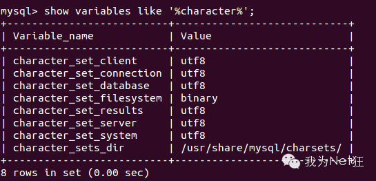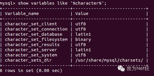 然后我们输入下面的查询语句来查看默认的字符集设置: