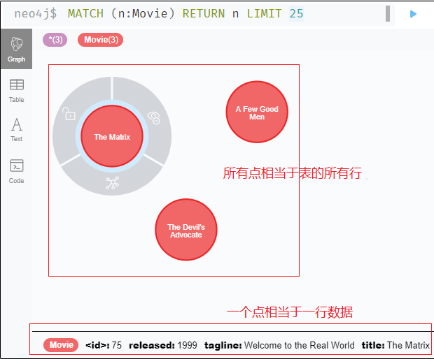 | 点数据(标签+属性键值对) | (TheMatrix:Movie {title:'The Matrix', released:1999, tagline:'Welcome to the Real World'}) | select * from Movie where id = 0; |