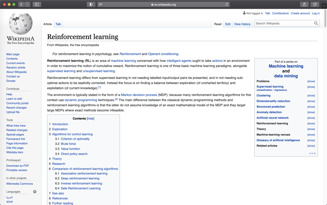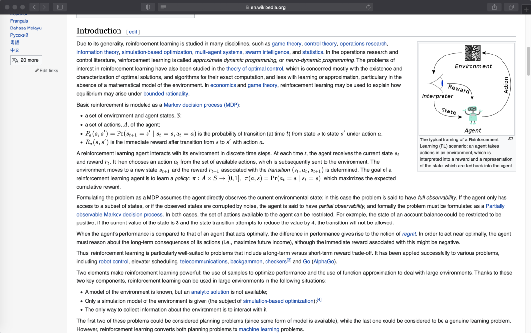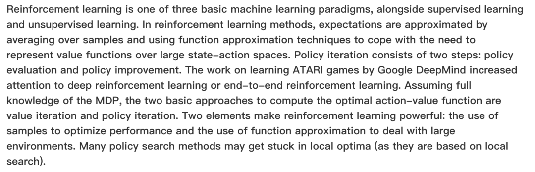 import bs4 as bsimport urllib.request #解析URL的包import re #用于文本预处理的正则表达式的库import nltknltk.download('punkt')url="https://en.wikipedia.org/wiki/Reinforcement_learning"scraped_data = urllib.request.urlopen(url)#urlopen:抓取数据article = scraped_data.read()#读取URL中的数据parsed_article = bs.BeautifulSoup(article,'lxml')paragraphs = parsed_article.find_all('p')article_text = ""#检索<p>标记内的文本数据for p in paragraphs:article_text += p.textprint(article_text)