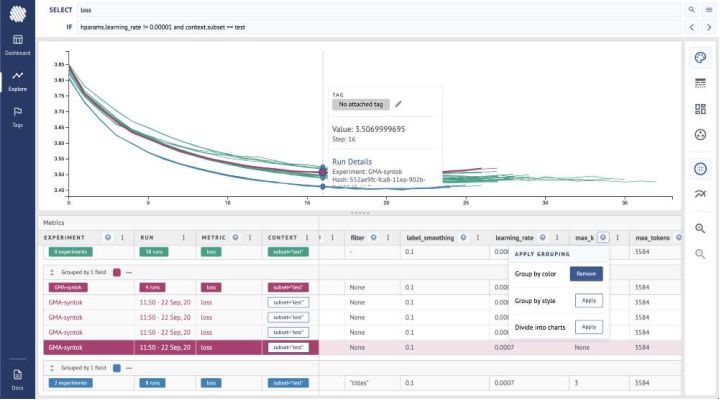 对于搜索/选择的实验指标,按不同的参数分组以查看效果。这意味着您只需一个按钮就可以了解参数是如何影响您的训练跑步的。