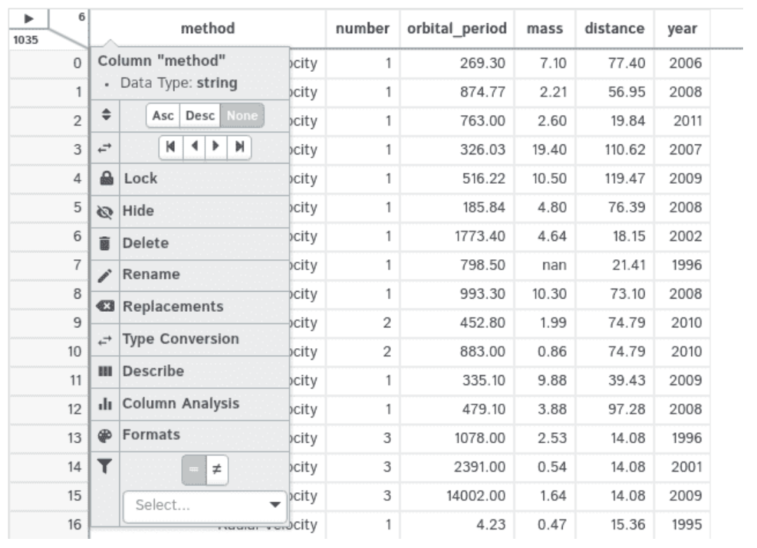 在此菜单中,我们可以找到的最有趣的选项是Describe(描述),它显示了所选列的统计分析结果;Column Analysis(列分析),显示了所选列的直方图。