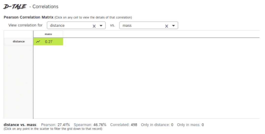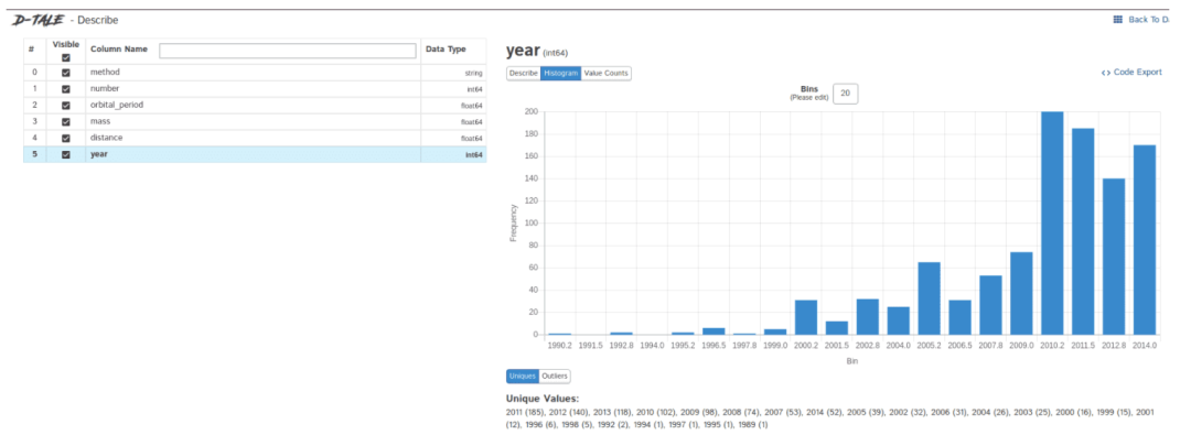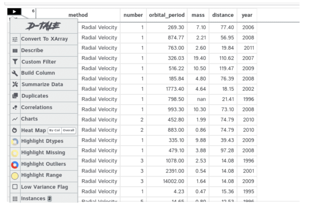 import seaborn as snsdf=sns.load_dataset(‘planets’)dtale.show(df, ignore_duplicate=True)