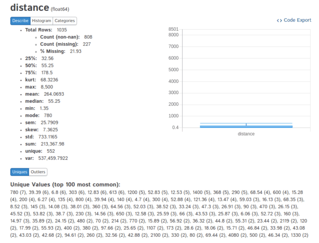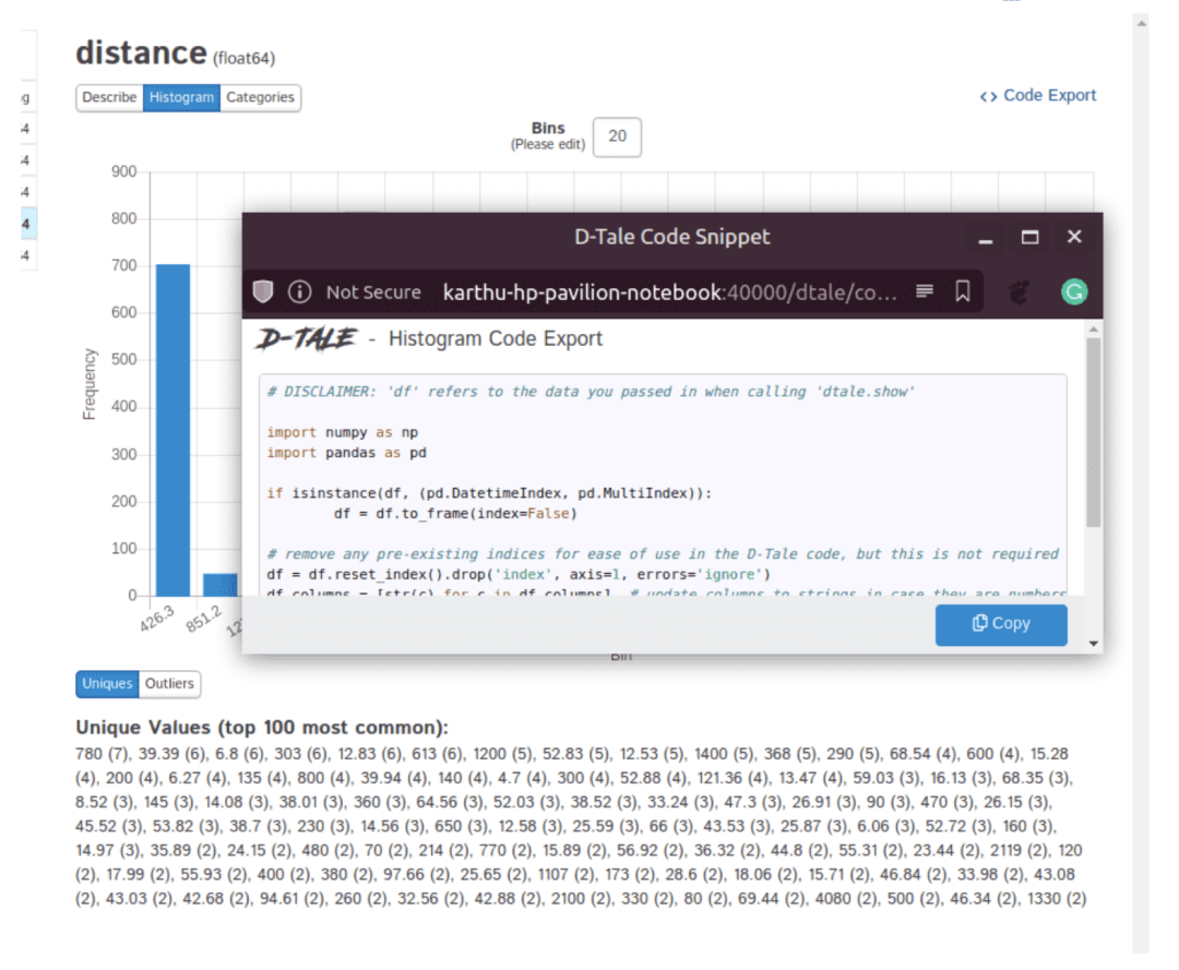 该库的另一个重要功能是在右上角的“Code Export”选项。此功能提供了特定输出的代码。同样,在“Describe”菜单中,我们将能够在底部看到所有异常值和“唯一性”值。