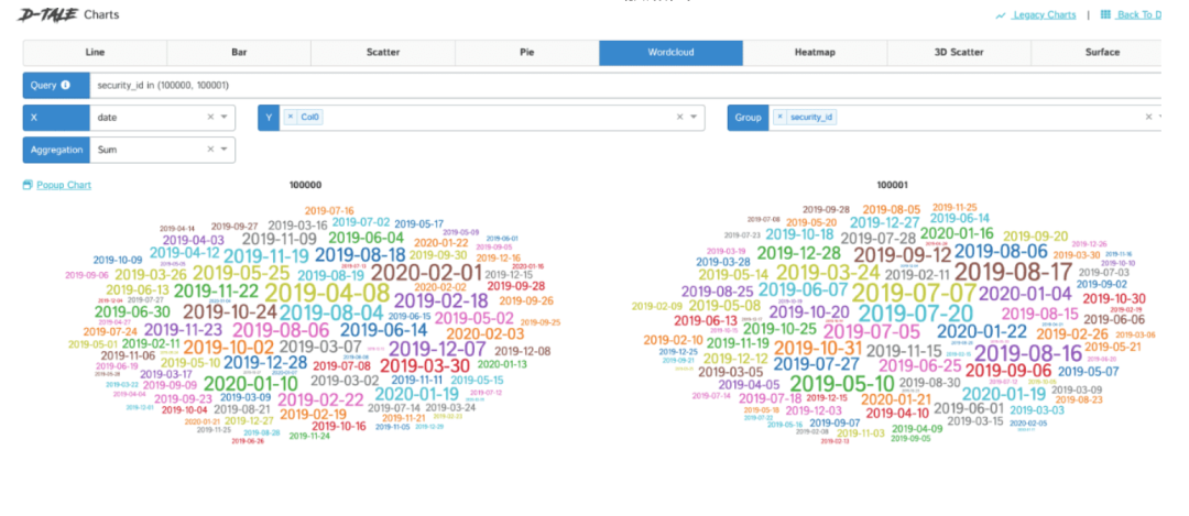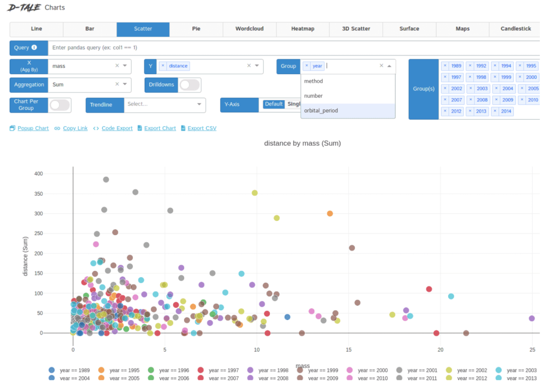 主菜单中的图表选项可帮助我们可视化所有不同类型的图表(折线图,条形图,ScatterPlot,圆形图,Wordcloud,Heatmap,3D ScatterPlot和Surface)。D-Tale的神奇功能之一是交互式绘图,它还支持3D图表和带有group by和聚合功能的动画。它非常有用,因为可以使用不同的图表来可视化任何类型的关系。下图显示了我们可以使用D-Tale中的Chart选项生成的一些图表示例。