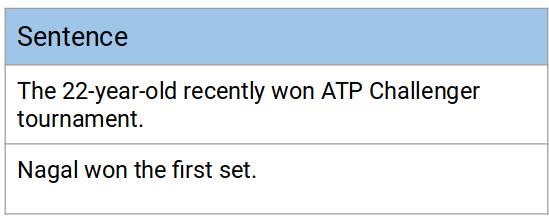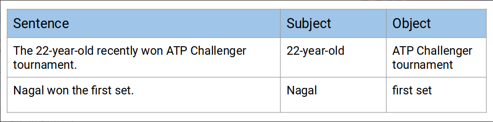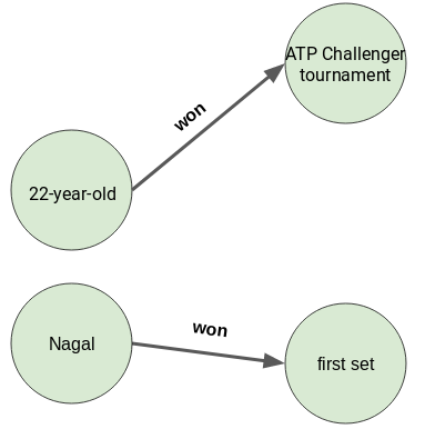 doc = nlp("Nagal won the first set.")for tok in doc:print(tok.text, "...", tok.dep_)