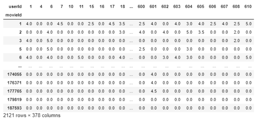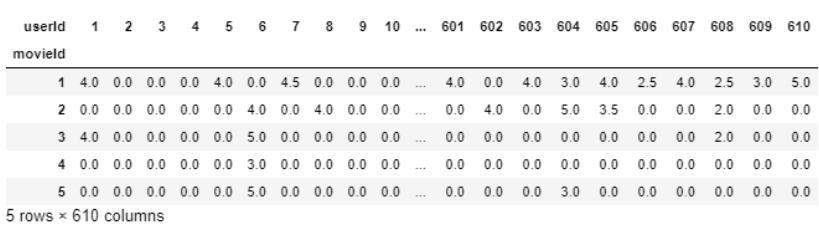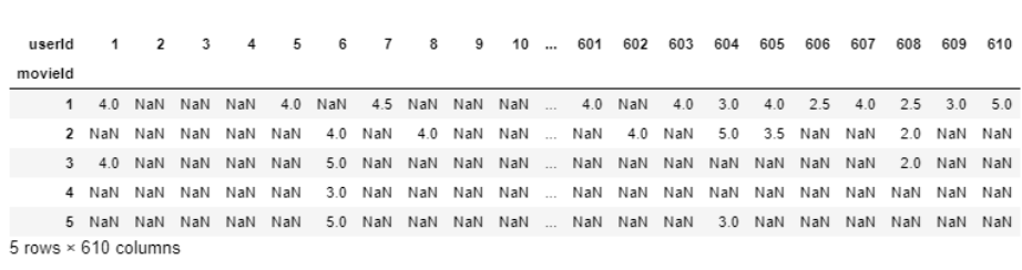 我们可以看到userId1已经看过movieId1和3,并且对他们两个的评分都为4.0,但没有对movieId2进行评分。因此,我们将创建一个新的数据框,其中每一列将代表每个唯一的userId,每一行代表每个唯一的movieId。